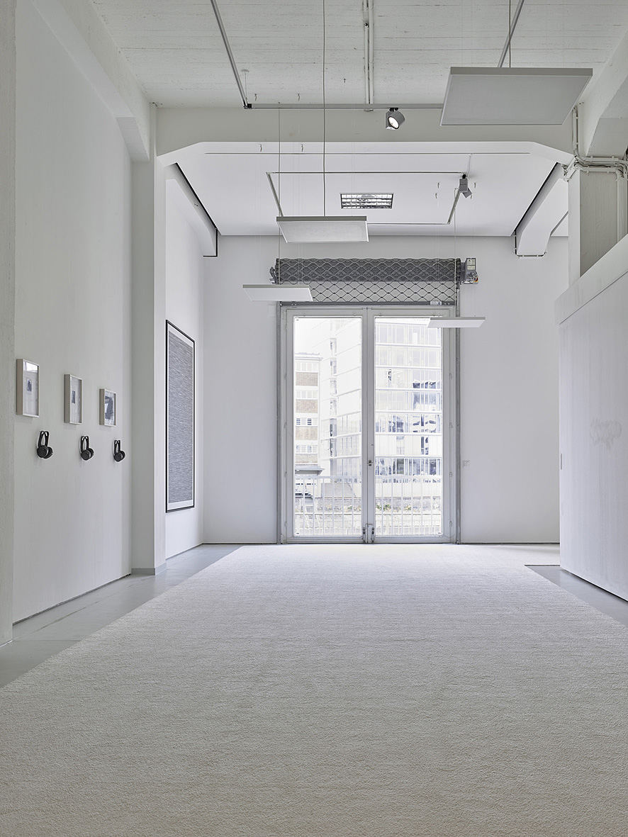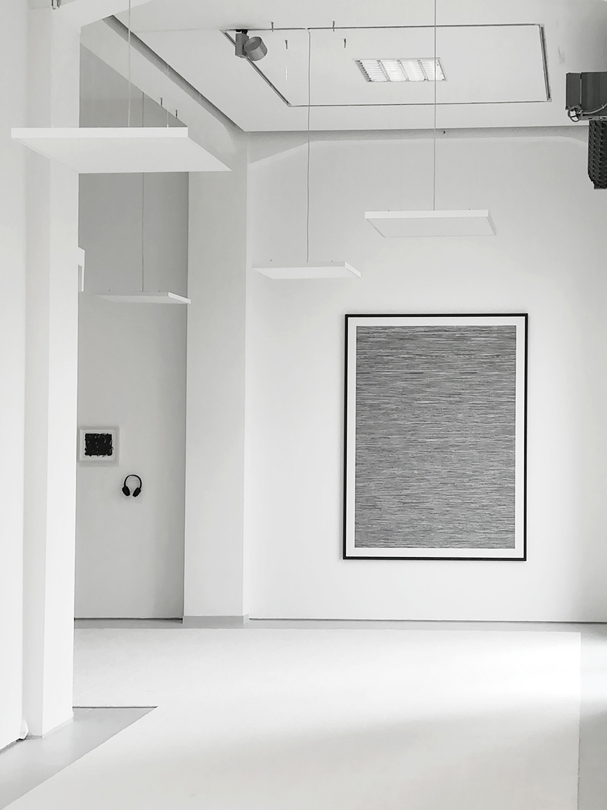 documentation of the exhibition "Listen to image, look at the sound" with pieces of the "Transcription-Image" work on the walls (photo credits by Achim Kukulies)