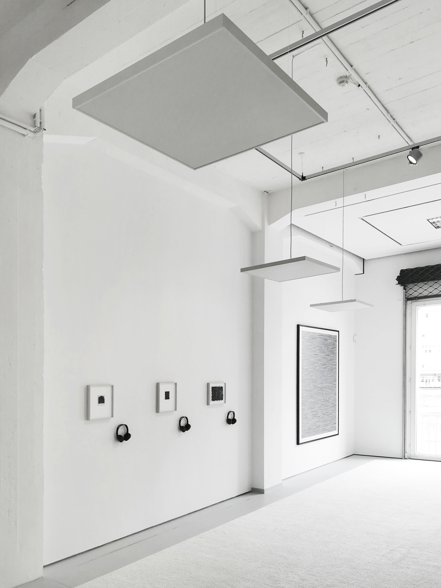 documentation of the exhibition "Listen to image, look at the sound" with pieces of the "Transcription-Image" work on the walls