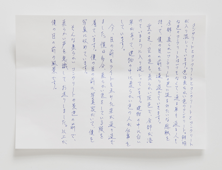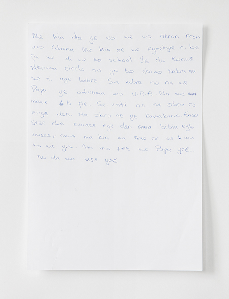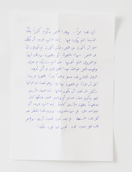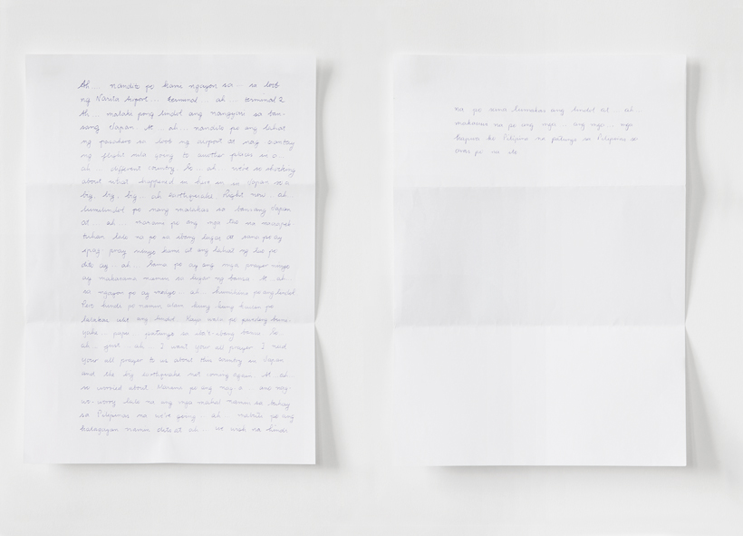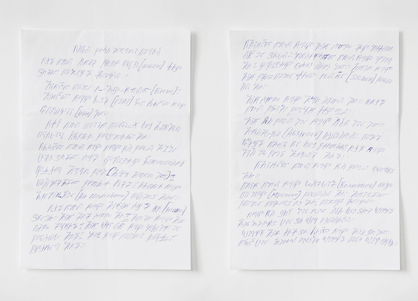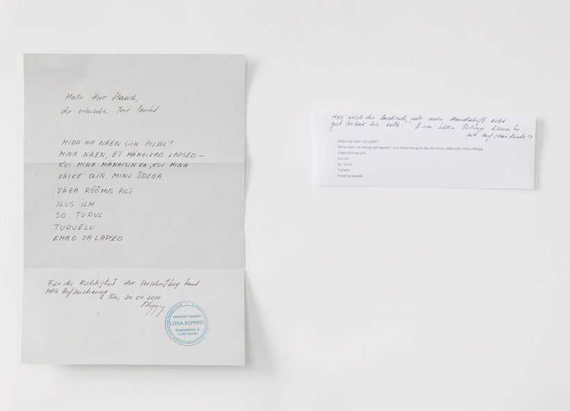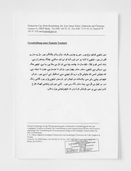 Transcription - Image (part 4) is another transformation in this series. The basis material is the description audio-file from "part2", whis was sent to a certified translater to handwrite the description on a paper without any translation.