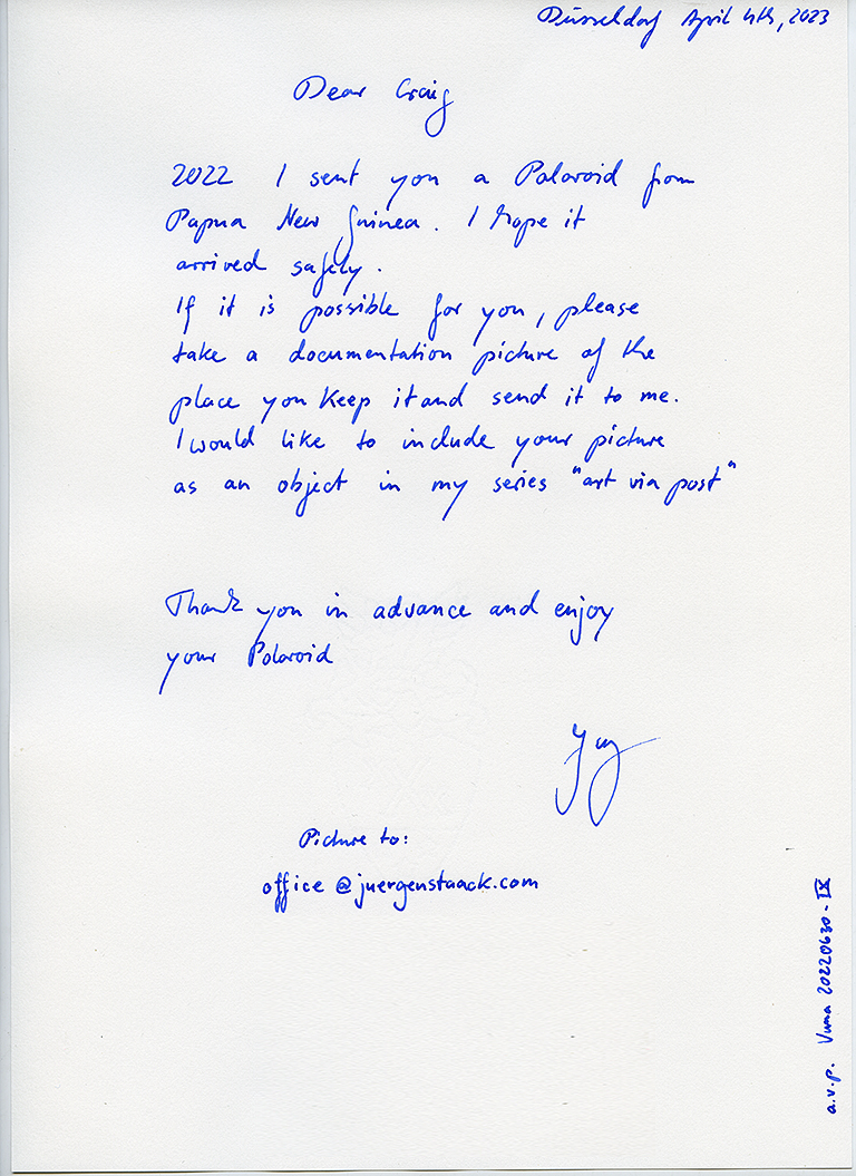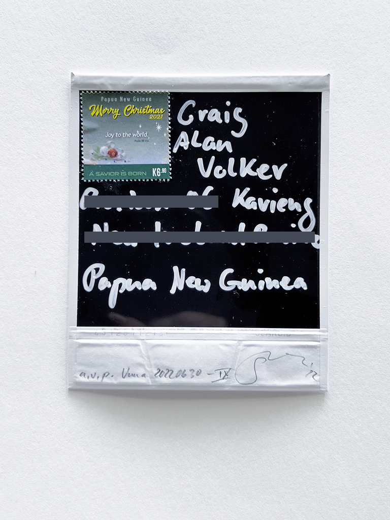 A year later (2023) I wrote a letter in which I referred to the Polaroid that had been sent, enclosed a documentary photo and asked for the current storage location to be documented and returned to me. This documentary photo of the place where the Polaroid is located becomes part of the art project and establishes a relationship to the original, Papua New Guinea and Germany and the person with me. Not all Polaroids arrived, not all person took a picture and set it back, some are still missing.