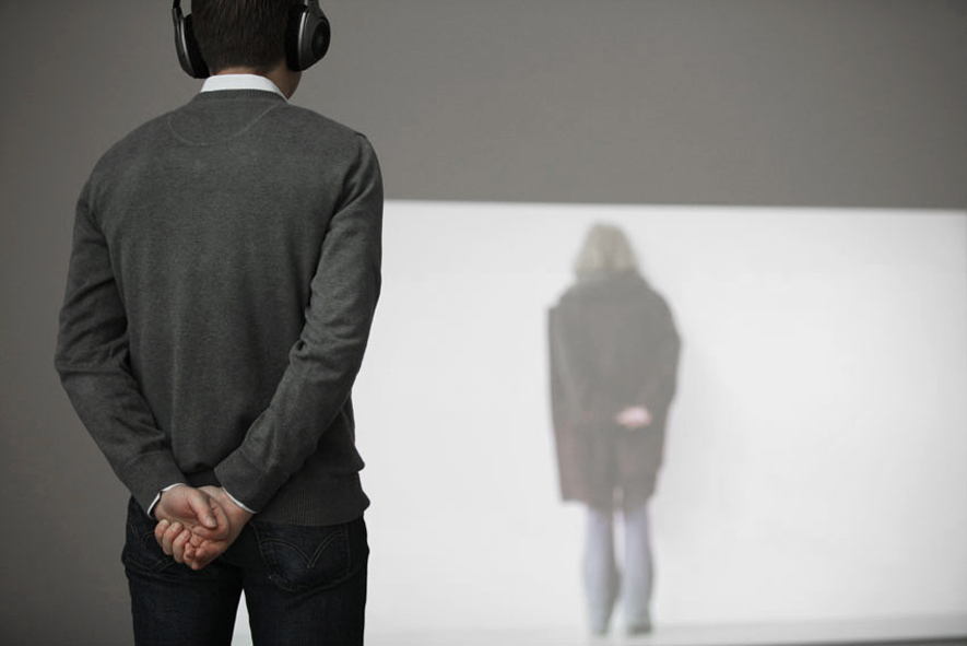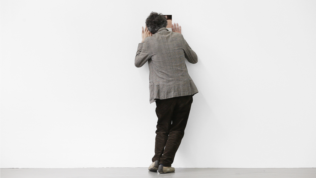 The peephole is set up that it‘s impossible to see the walls, ceiling or ground behind the wall. The performer must move in front of the wall to see all corners of the image, which makes him an image by him/herself.