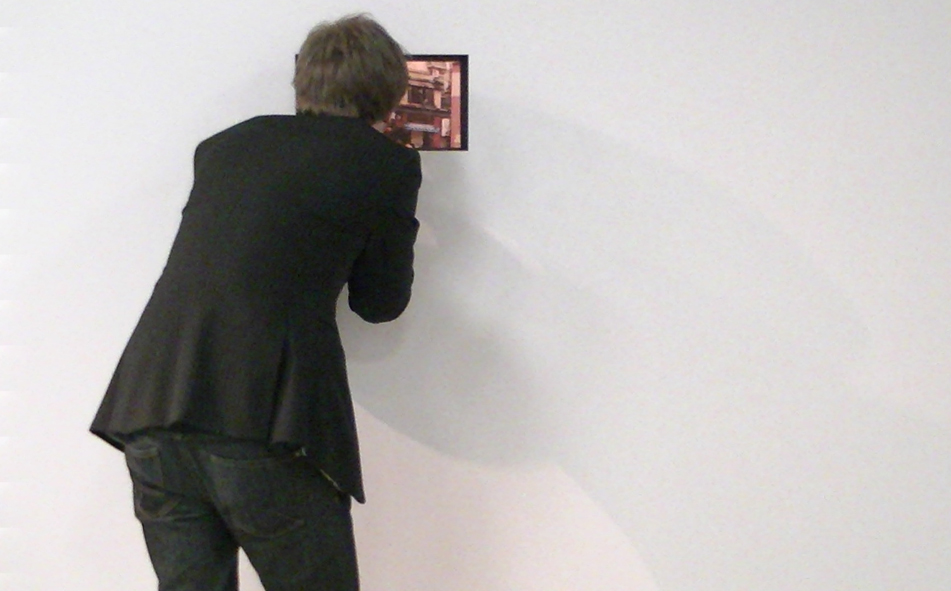 Visitor and the image... , is a series of performances with images behind a wall. A large-size photo print is hidden behind a wall, visible only through a small peephole; the beholder (only one per day allowed) is kindly asked to describe loudly what she/he is seeing; the description will be heart by other visitors who share the same moment in the exhibition space.